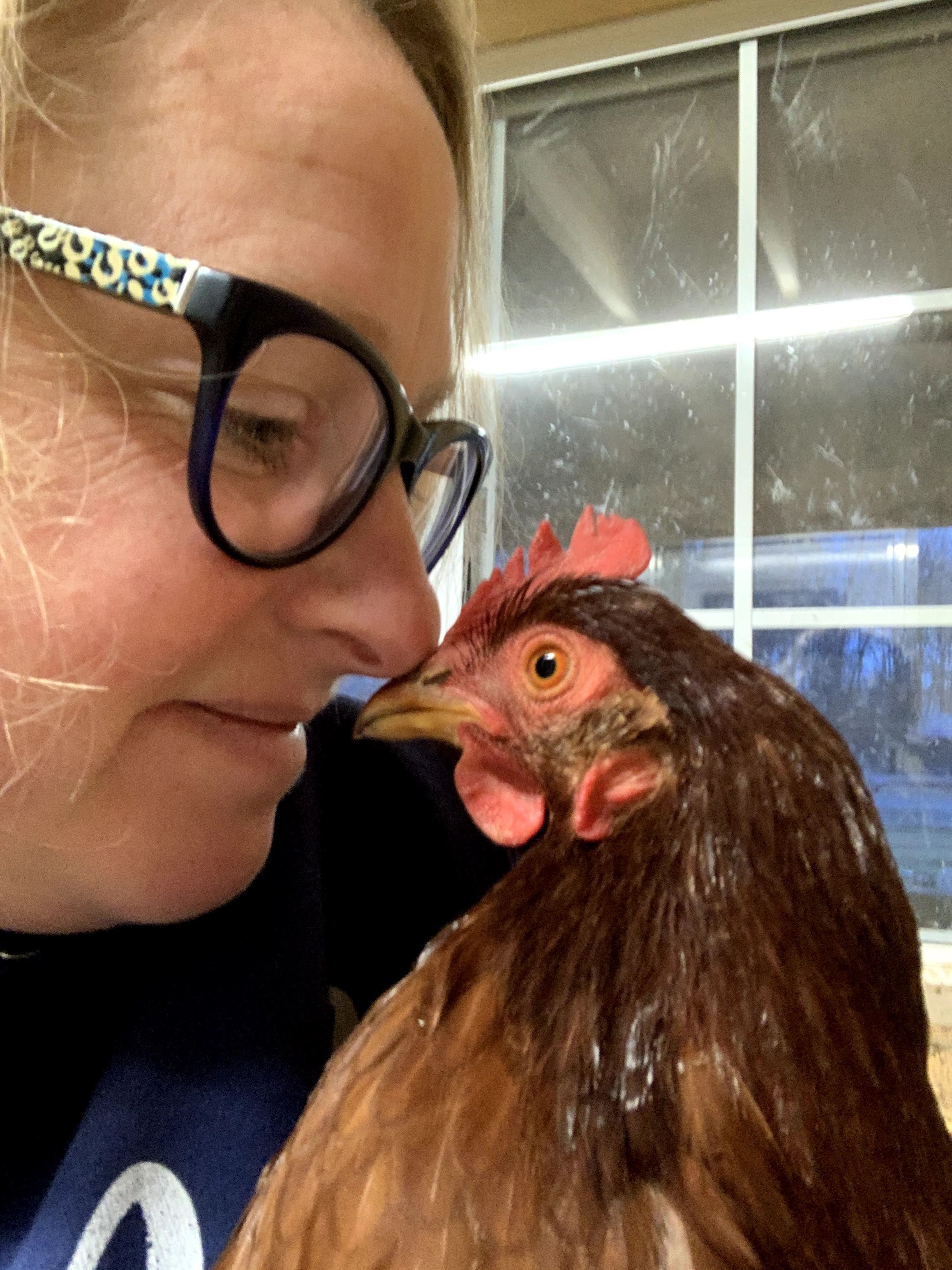 One day, a few weeks into our new routine, one of the chickens who enjoyed a snuggle the most, Chili Pepper, became ill. She was lethargic, not eating, and had a big lump on her belly that felt like a hot water bottle. I tried the things I knew to help her. When those didn’t work we took her to a local veterinary services chain. They took her into the office, as it was the pandemic, so we had to wait in the car. They called us in the car and said they couldn’t tell what was wrong with her. They said that they could do (expensive) X-rays to see if there was a blockage, but if there was a blockage they would need to consider surgery. They said that anesthesia wasn’t an exact science for birds and she still may die. They told us that there wasn’t anything else they could do, but that they could euthanize her if we wanted. I wept. She was the sweetest bird! I decided to bring her home and if she passed away, she would do it among her “sisters” that she had grown with. I just happened to send an Instagram message to a friend I knew and told her about the situation. She asked if I had tried yogurt or apple cider vinegar. I had not, but it couldn’t hurt! We only had blueberry Greek yogurt, so I gave some to her and she gulped it up! She ate some of that for the next few meals and within 48 hours she was her happy self! Chili was eating and drinking, moving around as normal! I was so relieved. She has been the best farm ambassador when people come for the farm tour or just to visit. She will tug on a shirt sleeve as if to say, “Hey, pick me up!” and once in someone’s arms, she will bury her head into the crook of your neck. She is a favorite.